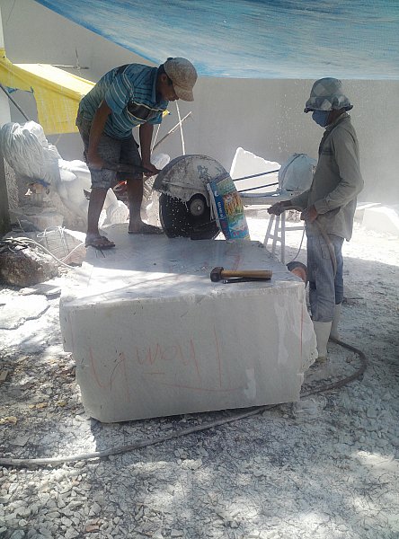 Sản phẩm điêu khắc mỹ nghệ đương nhiên phải được điêu khắc bằng tay thì sản phẩm mới đạt tiêu chuẩn hình ảnh cao, mỗi sản phẩm hoàn thành đòi hỏi rất nhiều thời gian, qua nhiều công đoạn, từ một tảng đá rồi phác thảo sản phẩm phù hợp màu sắc và kích cỡ, đến làm thô, cho ra hình dạng, làm nguội, rồi đánh bóng. Sản phẩm nhỏ thì vài ngày, sản phẩm lớn hay công trình thì vài tháng, đôi khi cả năm. Nó thể hiện cả sự đam mê nghề nghiệp và sự kiên trì của nghệ nhân. Nguyên liệu chủ yếu là đá cẩm thạch và đá sa thạch đủ các màu sắc được lấy từ các mỏ đá Quỳ Hợp, Nghệ An - Hà Trung Thanh Hóa, Khu Rừng Thông...